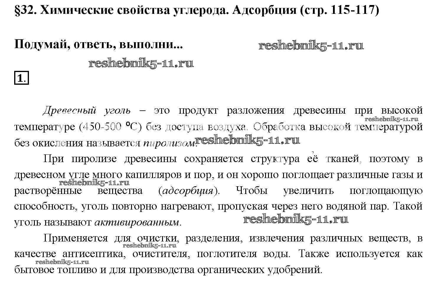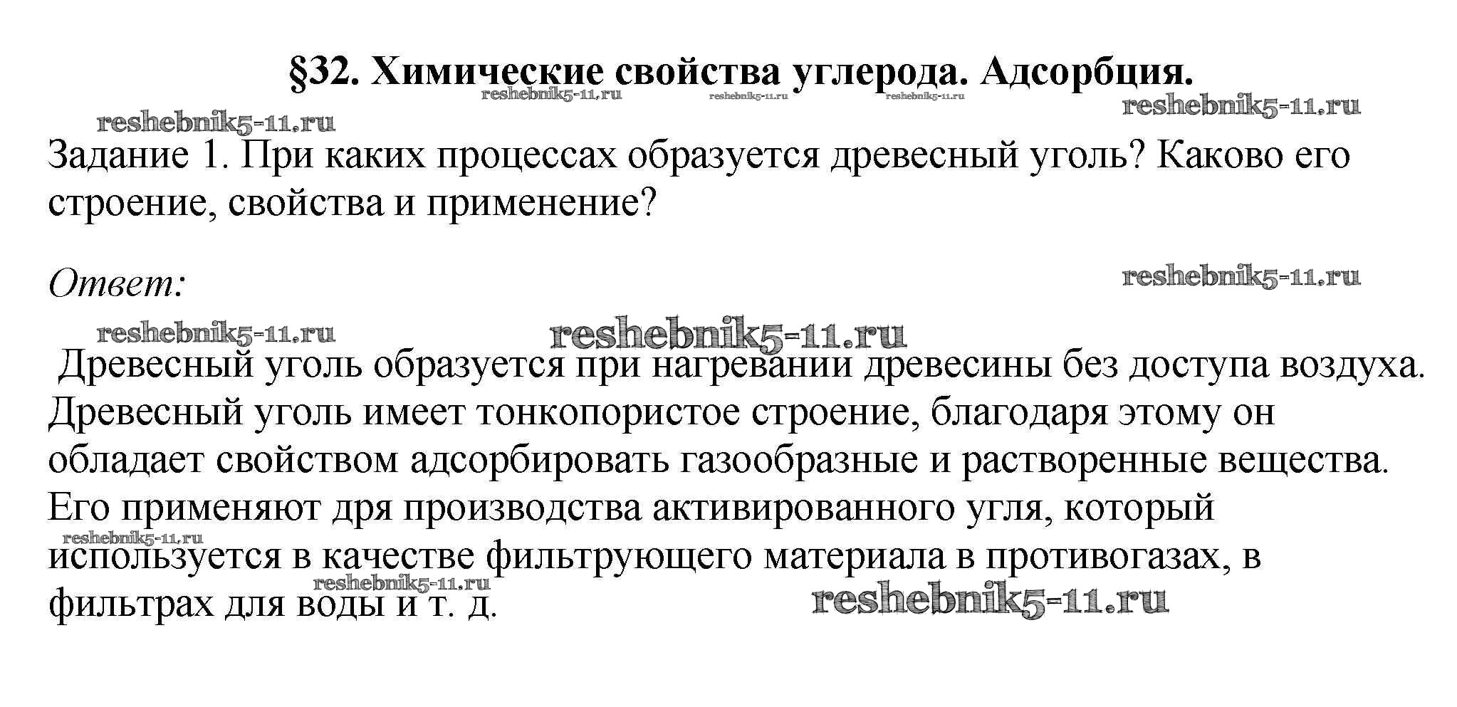 Готовая домашняя работа с ответами по Химии за 9 класс Рудзитис, Фельдман Учебник УМК Просвещение 2016 ФГОС - § 32. Химические свойства углерода. Адсорбция 1