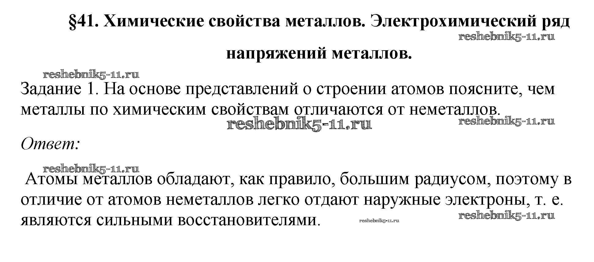 Готовая домашняя работа с ответами по Химии за 9 класс Рудзитис, Фельдман Учебник УМК Просвещение 2016 ФГОС - § 41. Химические свойства металлов. Электрохимический ряд напряжения металлов 1