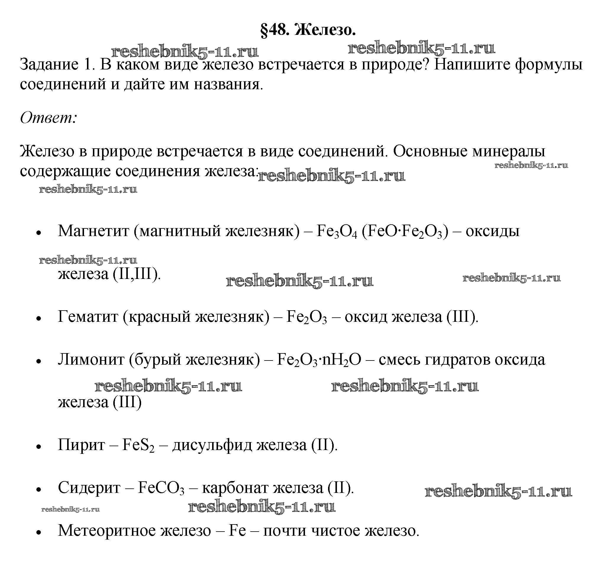 Готовая домашняя работа с ответами по Химии за 9 класс Рудзитис, Фельдман Учебник УМК Просвещение 2016 ФГОС - § 48. Железо 1