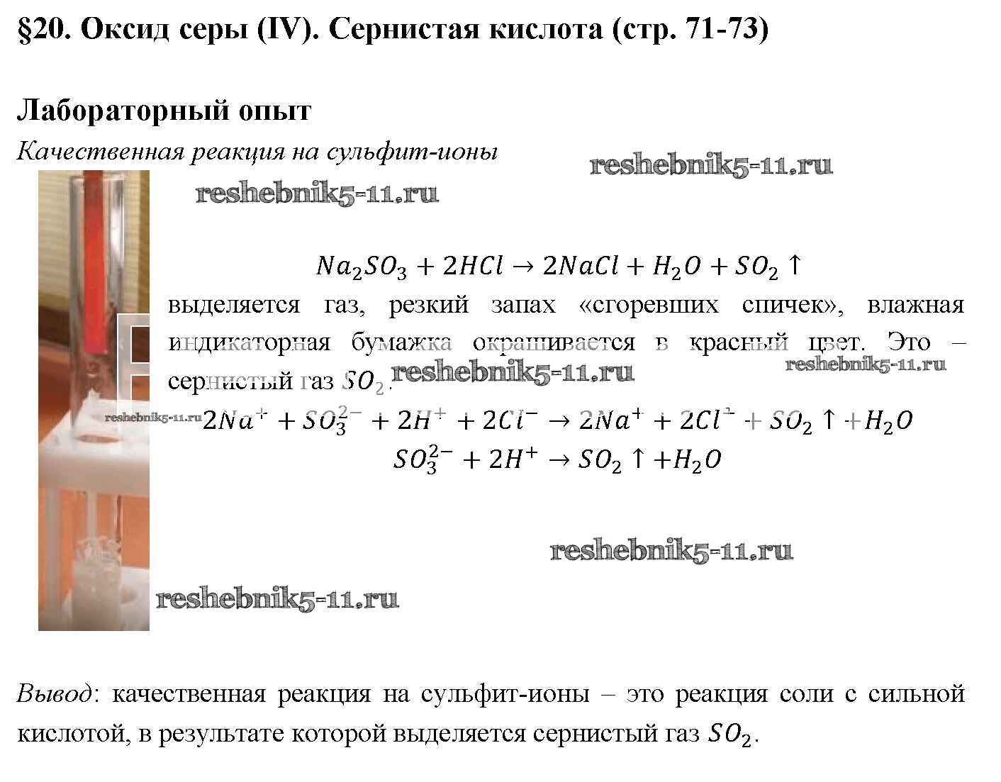 Готовая домашняя работа с ответами по Химии за 9 класс Рудзитис, Фельдман Учебник УМК Просвещение 2016 ФГОС - § 20. Оксид серы (IV). Сернистая кислота Лабораторный опыт