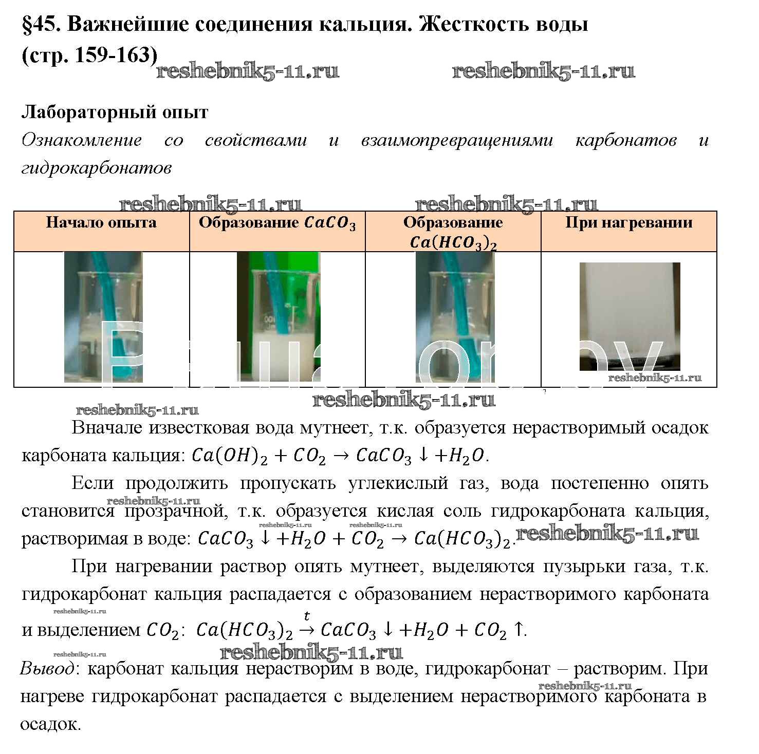Готовая домашняя работа с ответами по Химии за 9 класс Рудзитис, Фельдман Учебник УМК Просвещение 2016 ФГОС - § 45. Важнейшие соединения кальция. Жесткость воды Лабораторный опыт