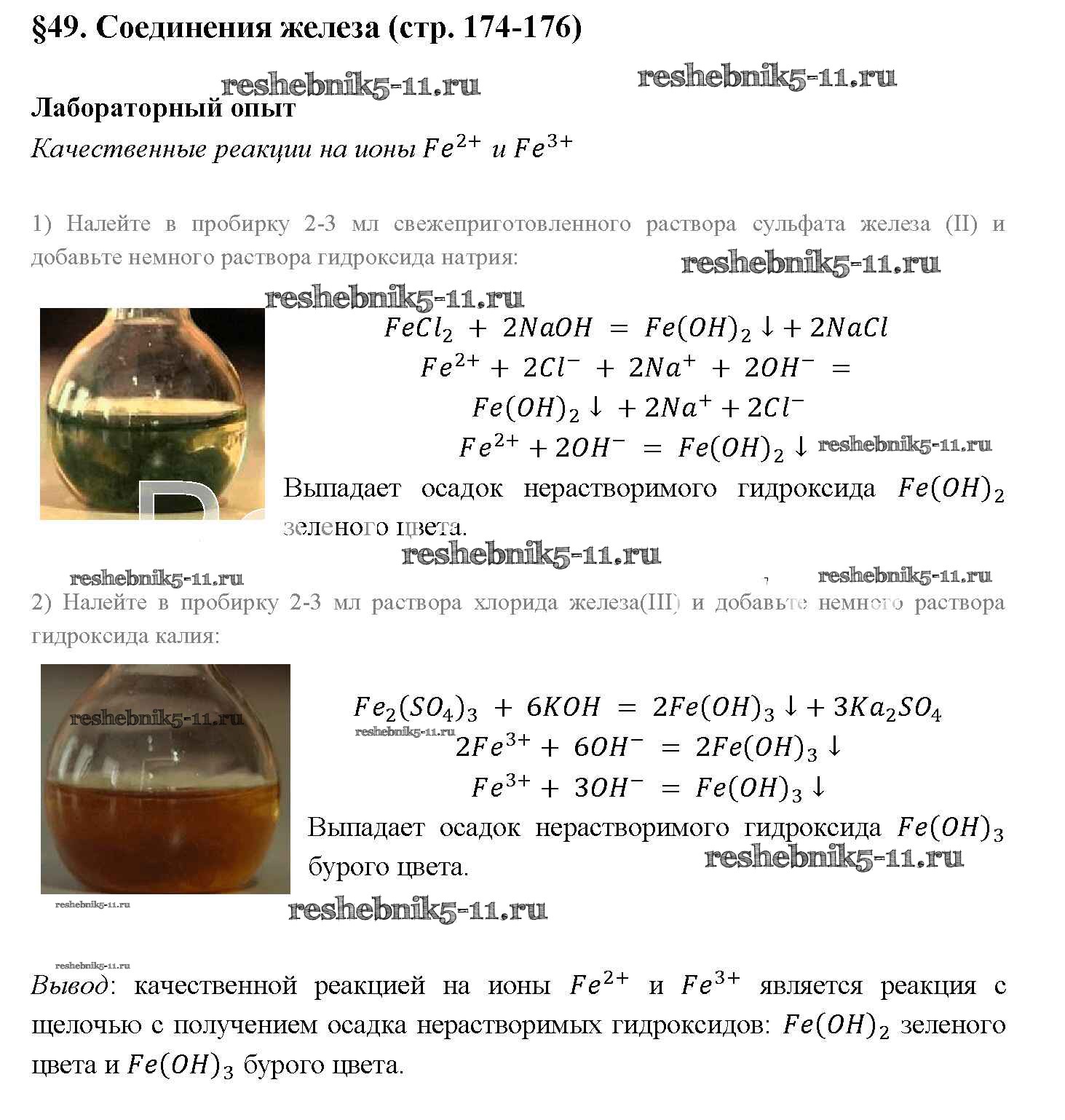 Готовая домашняя работа с ответами по Химии за 9 класс Рудзитис, Фельдман Учебник УМК Просвещение 2016 ФГОС - § 49. Соединения железа Лабораторный опыт