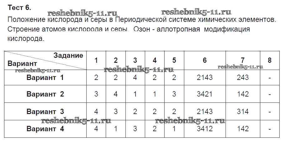 Готовая домашняя работа с ответами по Химии за 9 класс Боровских Тесты УМК Экзамен 2013 ФГОС - Тесты Тест-6. Строение атомов кислорода и серы. Озон