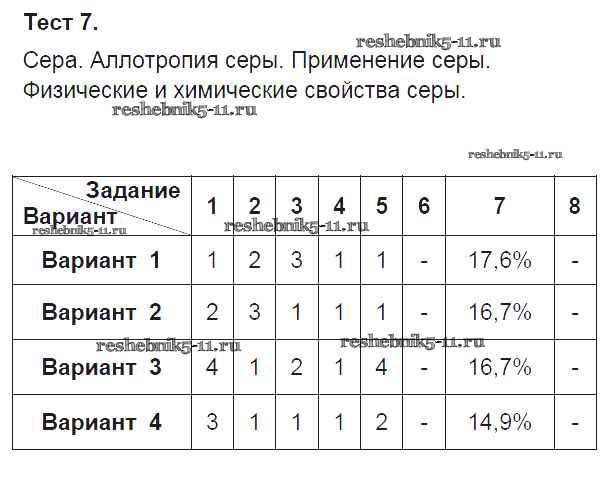 Готовая домашняя работа с ответами по Химии за 9 класс Боровских Тесты УМК Экзамен 2013 ФГОС - Тесты Тест-7. Сера. Аллотропия серы. Применение серы