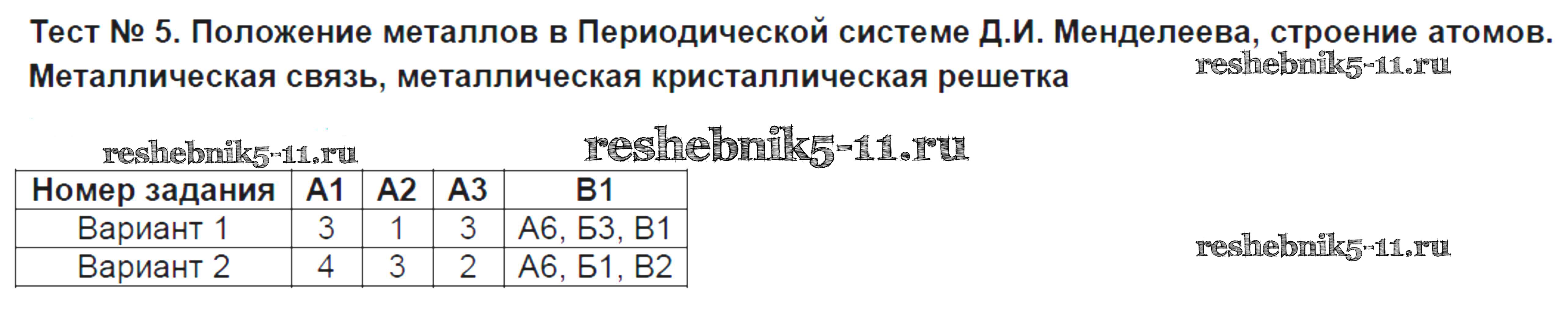 Готовая домашняя работа с ответами по Химии за 9 класс Стрельникова Контрольно-измерительные материалы (КИМ) ВАКО 2017 ФГОС - Тесты Тест №5. Положение металлов в Периодической системе Д.И. Менделеева, строение атомов