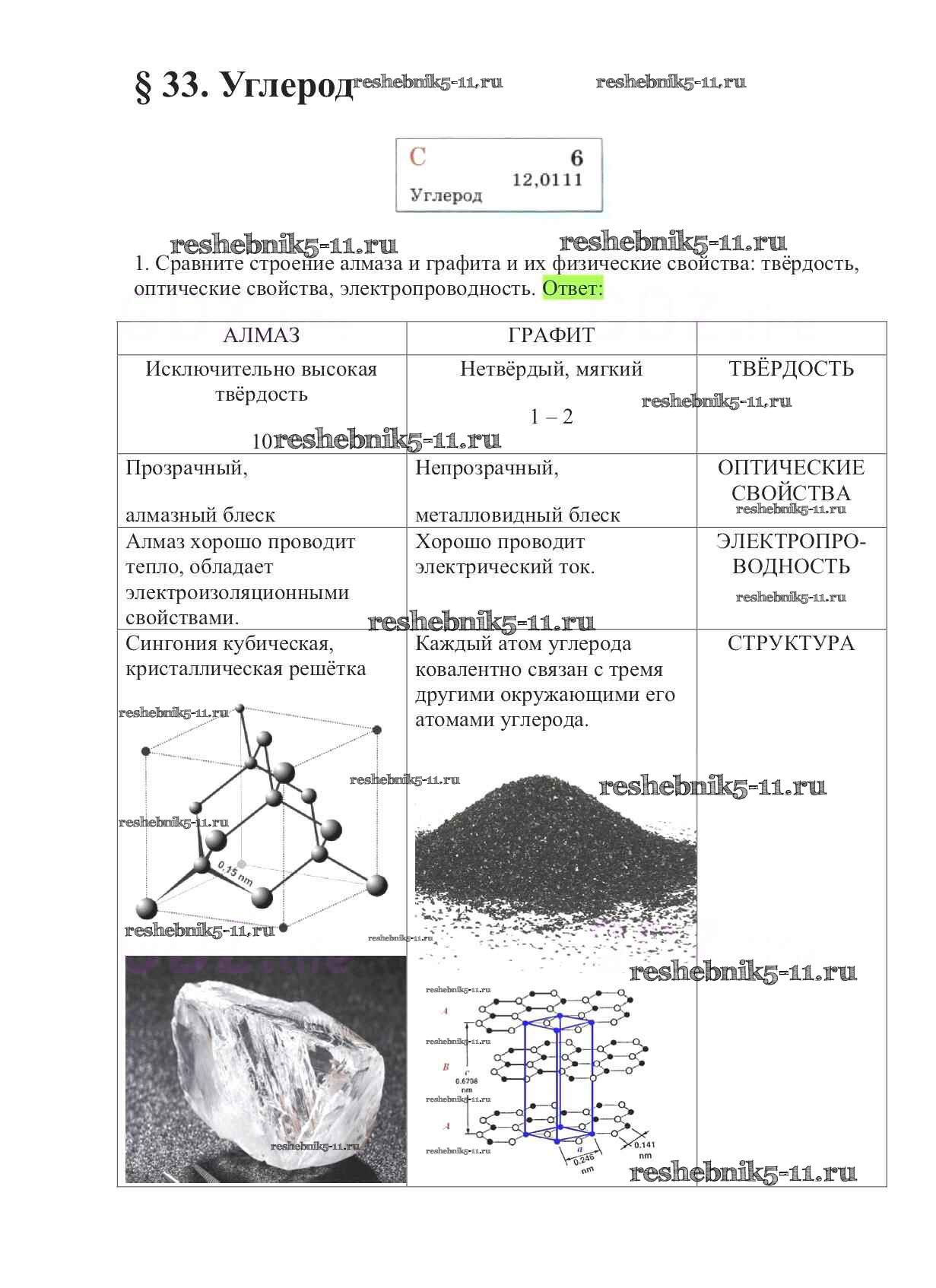 Готовая домашняя работа с ответами по Химии за 9 класс Габриелян Учебник Вертикаль Дрофа 2014 ФГОС - §33. Углерод 1