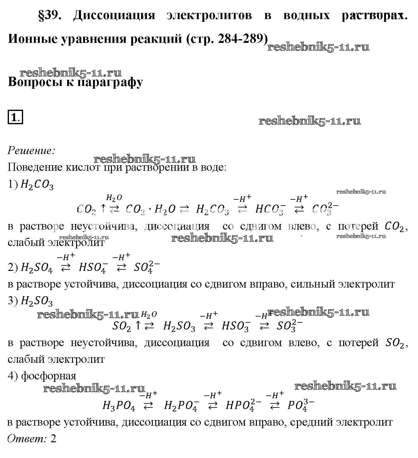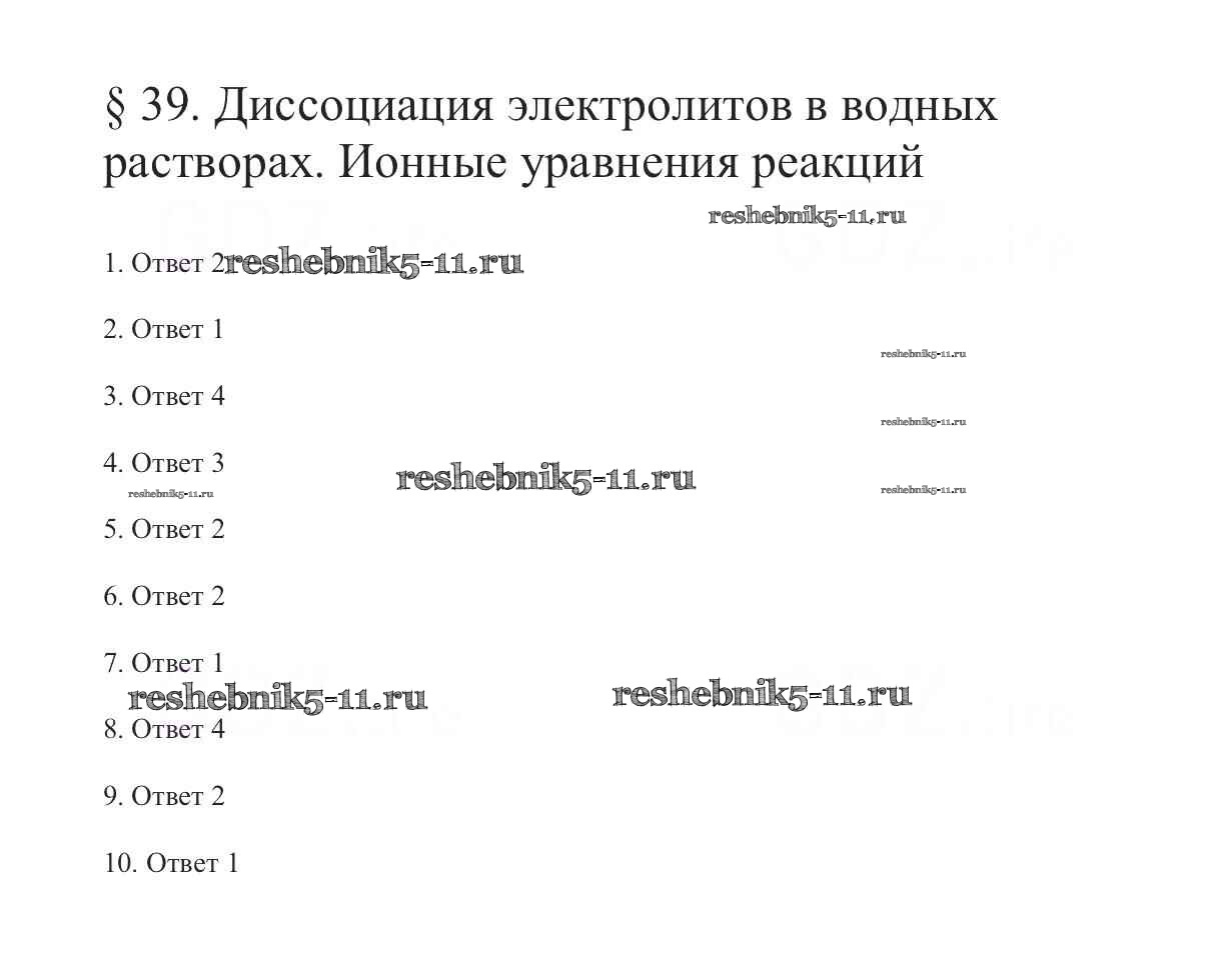 Готовая домашняя работа с ответами по Химии за 9 класс Габриелян Учебник Вертикаль Дрофа 2014 ФГОС - §39. Диссоциация электролитов в водных растворах. Ионные уравнения реакций 1