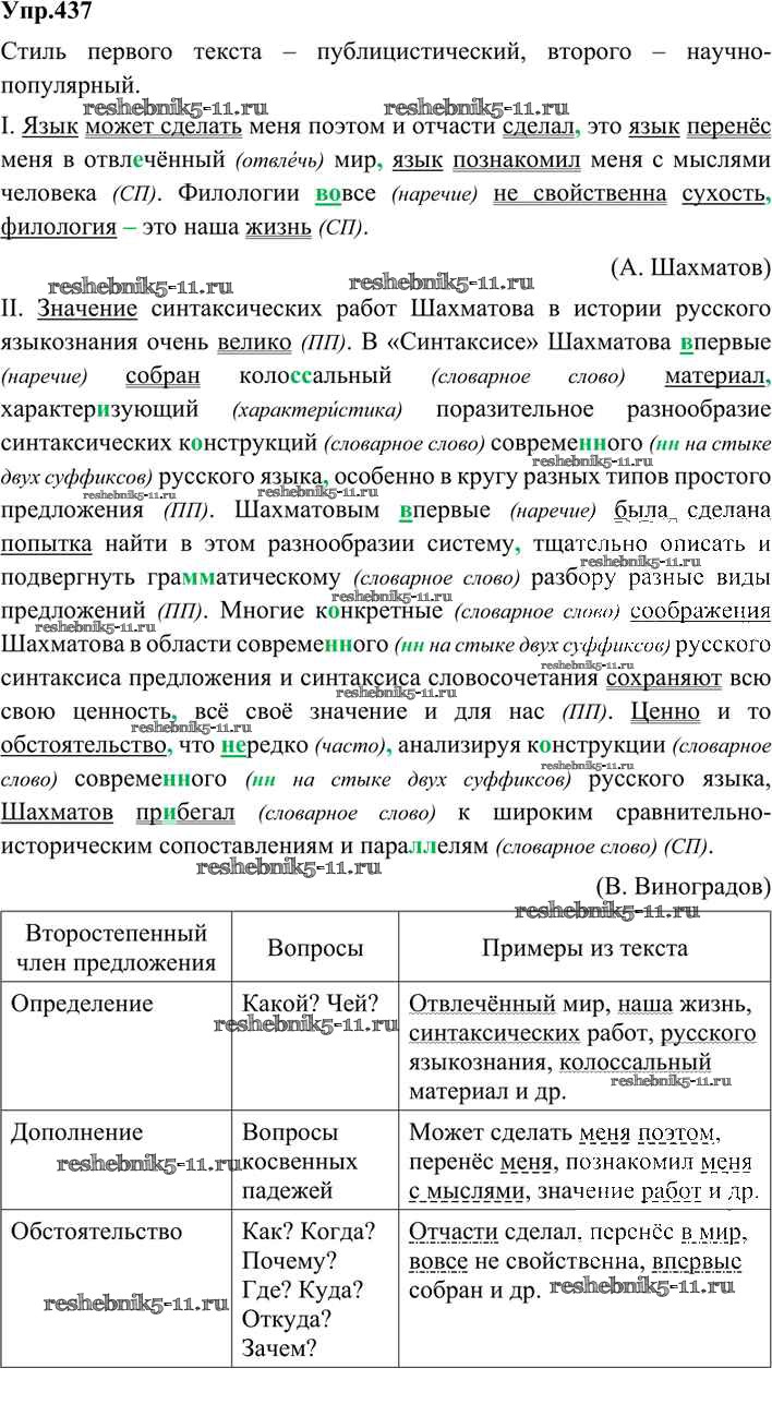 Готовая домашняя работа с ответами по Русскому языку за 9 класс Бархударов, Крючков, Максимов, Чешко Учебник Просвещение 2011 ФГОС - Упражнения 437